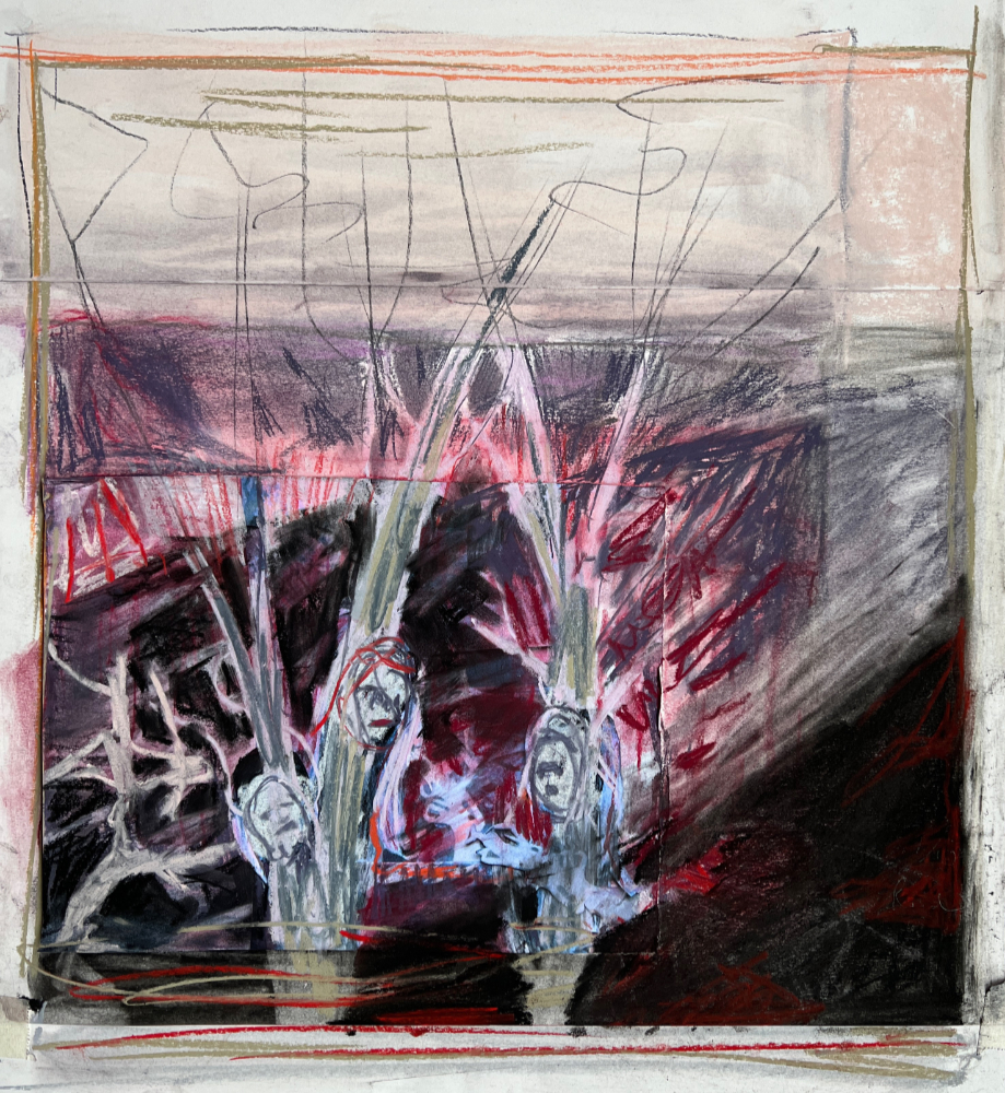 Under the Mulang, charcoal, gouache, collage on paper, 2024