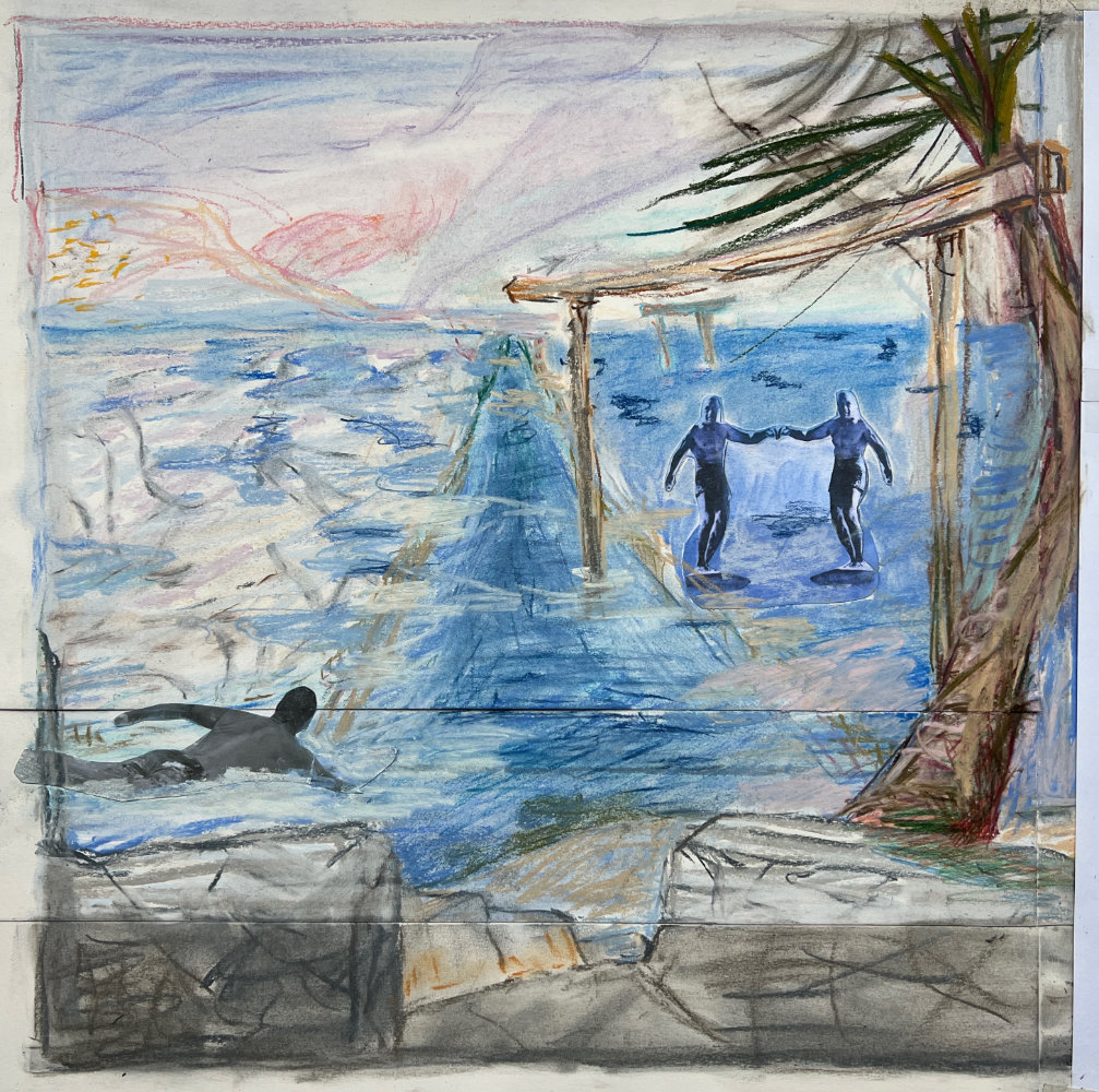 A Wave, 57 x 56.5 cm, graphite, charcoal, goache, collage, 2025